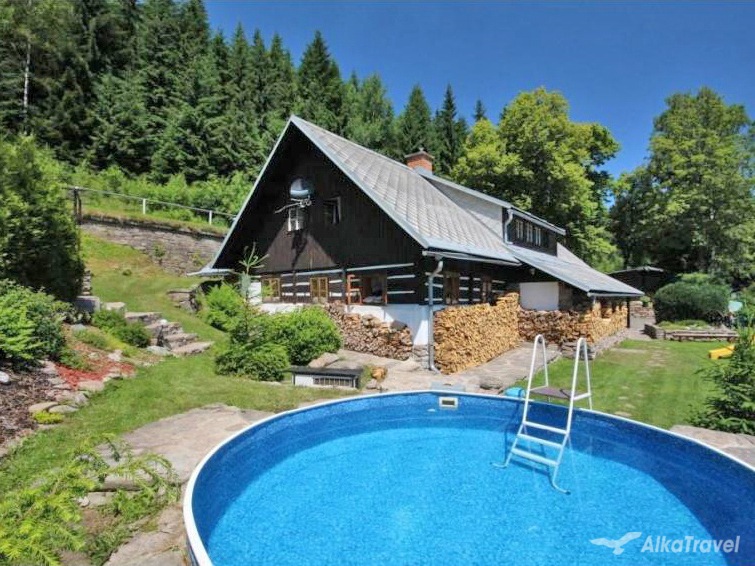 ORLICKÉ HORY: prostorná roubená chalupa se ZAPUŠTĚNÝM vyhřívaným BAZÉNEM, WELLNESS a WIFI internetem, 1,5 km od Ski centra Říčky, 6 km od Rokytnice v Orlických horách, 18 km od Rychnova nad Kněžnou a 57 km od Hradce Králové.