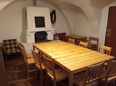 V objektu v přízemí: chodba, společenská místnost (stůl, židle, krb), kuchyně (plynový sporák, trouba, lednice, mikrovlnná trouba, varná konvice, stůl, židle, TV+SAT), 1/3 ložnice (2x lůžko, přistýlka), 1/2 ložnice (2x lůžko), samostatné WC (umyvadlo), schody do patra (strmější).