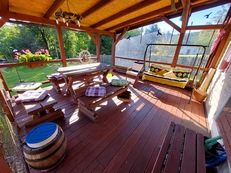 U objektu neoplocená zahrada, nadzemní bazén (průměr 3 m – k dispozici červenec a srpen), parkování pro 2 auta u domu, kryté posezení s houpačkou, gril, ohniště s posezením, zatravněná plocha, pískoviště, dětské hřiště, dětský domeček. V okolí turistické a cykloturistické trasy - pestrá síť přírodních trailů s náročným i lehkým terénem přímo v okolí, půjčovna kol.