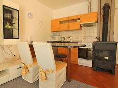 V patře: 1/2 + 1 ložnice (BVTV, HIFI souprava), 1/2 otevřená ložnice (1x dvoulůžko, BVTV). Možnost navýšení kapacity o 1 osobu (na rozkládacím gauči - na vyžádání). Topení: krbová kamna - tuhá paliva.