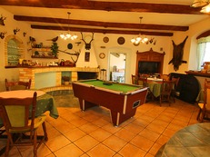V objektu v přízemí: velká obývací a společenská místnost pro celý objekt s krbem a barem, kávovarem, toustovačem, BVTV + SAT, hifi věž, stoly + židle.