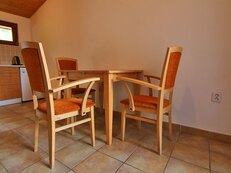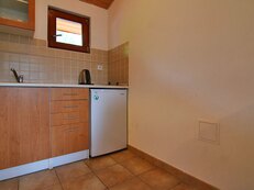 V objektu v přízemí: obývací místnost s posezením, kuchyňským koutem (plotýnkový vařič, rychlovarná konvice, lednička s mrazákem) a 3 lůžky, koupelna (sprchový kout, umyvadlo, WC). Venkovní posezení na balkoně.