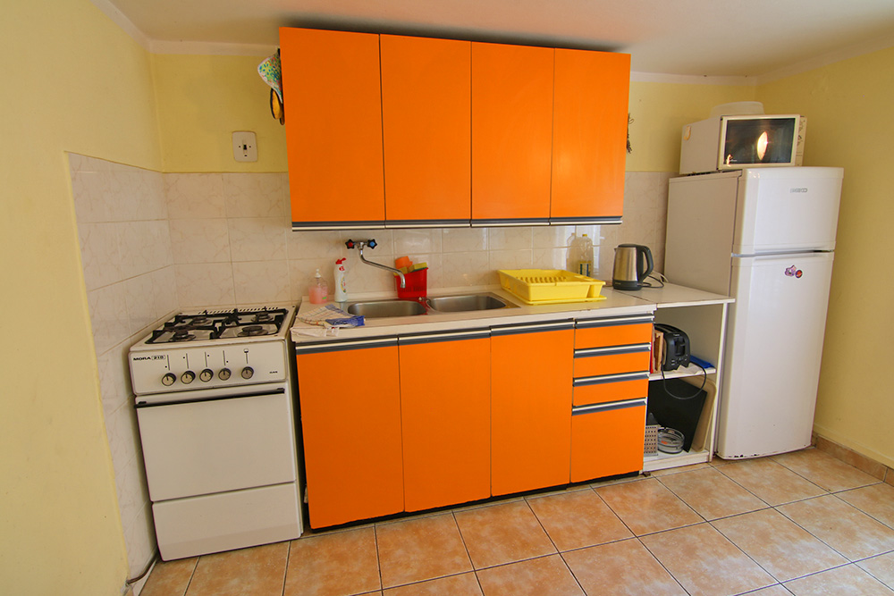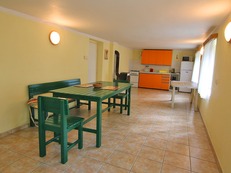 V přízemí dostupné venkem a po schodech: společenská místnost s kuchyňským koutem (lavice, židle, stůl, krb, sporák, trouba, lednice + mrazák, mikrovlnná trouba, varná konvice). Topení: přímotopy. domácí zvíře: ANO (poplatek 50,-Kč/noc).