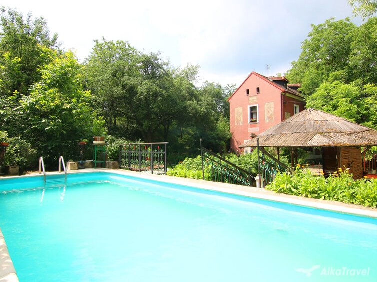 U objektu: velká a oplocená zahrada, solárně vyhřívaný a zapuštěný bazén (9 x 3,5, hloubka 1,5 m), pergola s posezením, antukový tenisový kurt, zahradní nábytek, ohniště, gril, parkování.