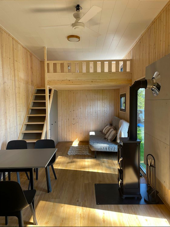 V objektu: společenská místnost (pohovka, krb, stůl, židle) s kuchyňským koutem (indukční varná deska, lednice + mrazák, varná konvice), koupelna (sprchový kout, umyvadlo, WC). Na levé i pravé straně mini domku najdete v patře vždy dvoulůžko (180 x 200 cm - pro dospělé a 140 x 200 cm - pro 2 děti). Topení: krb - tuhá paliva, domácí zvíře: ANO (malé plemeno, 350 Kč).