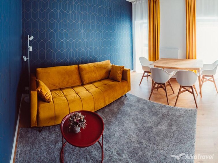 V apartmánu: LCD TV, WIFI, stolek, židle, rozkládací pohovka - 2x přistýlka, kuchyňský kout (lednice, vestavěná trouba s indukční varnou deskou, rychlovarná konvice, myčka, kávovar na kapsle), 1/2 ložnice (dvoulůžko), koupelna (sprchový kout/vana, umyvadlo, WC). Topení: ústřední topení.