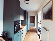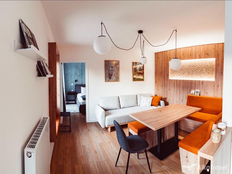 V apartmánu: LCD TV, WIFI, stolek, židle, lavice, pohovka - přistýlka, kuchyňský kout (lednice, vestavěná trouba s indukční varnou deskou, rychlovarná konvice, myčka, kávovar na kapsle), 1/2 ložnice (dvoulůžko), 1/3 ložnice (2x samostatné lůžko, přistýlka), koupelna (sprchový kout/vana, umyvadlo, WC). Topení: ústřední topení.