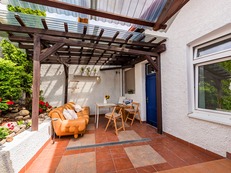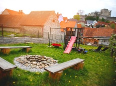 U objektu uzavřený dvůr s krytým posezením, zastřešený altán s posezením, venkovní gril, zahradní nábytek, dětský koutek (skluzavka, pískoviště, dětský domeček, houpačka), lehátka, ohniště.