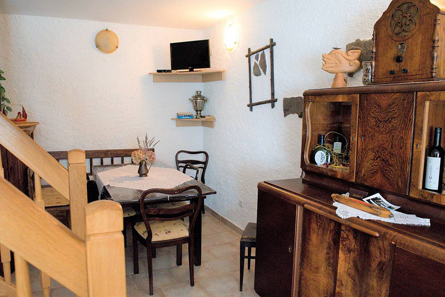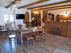 V objektu (3x apartmán, 10 osob): samostatný chod, předsíň, společenská místnost (stoly, židle, krb, TV) s kuchyňským koutem (el. sporák, lednice, mikrovlnná trouba, rychlovarná konvice, kávovar, toustovač, myčka nádobí), schody do patra - tato část je pro všechny apartmány/pokoje společná. 1/5 apartmán: TV, 1/3 ložnice (dvoulůžko, samostatné lůžko), 1/2 ložnice (2x samostatné lůžko), koupelna (sprchový kout, umyvadlo, WC). 1/3 pokoj: TV, 3x samostatné lůžko, koupelna (sprchový kout, umyvadlo, WC). 1/2 pokoj: TV, 2x samostatné lůžko, koupelna (sprchový kout, umyvadlo, WC). Topení: elektrické.