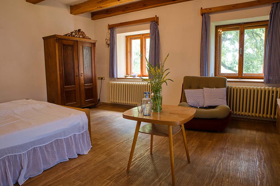 3. apartmán: ubytování až pro 8 osob. Jsou zde k dispozici dvě prostorné ložnice se 4 lůžky, kuchyňka, koupelna s vanou a toaletou. Špajz na jídlo s ledničkou. Vstup na venkovní posezení s grillem do uzavřené zahrady.