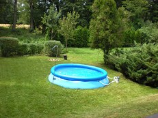 U objektu částečně oplocená zahrada s terasou a posezením, gril, bazén (průměr 4 m), ohniště a parkování.