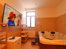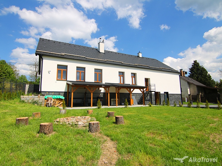 V objektu: společenská místnost (jídelní stůl, sedací souprava, 2 pevná lůžka, LCDBTV + SAT, krb, kulečník, šipky, playstation 4, kvízomat), kuchyňský kout (sklokeramická varná deska, mikrovlnná trouba, trouba, varná konvice, myčka nádobí, topinkovač, kávovar, velká dvoukřídlá lednice s mrazákem s možností výroby ledu, tyčový mixér), 1/2 ložnice (manželská postel, posezení, BVTV, tablet), 1/2 ložnice (manželská postel, posezení, BVTV, tablet), 1/4 ložnice (2x manželská postel, posezení, BVTV, tablet), koupelna (sprchový kout, 2x umyvadlo, vana, pračka, sušička, WC), 2 místa na nafukovací přistýlce, wellness místnost (vířivka, sauna s USB na vlastní hudbu, masážní sprcha, lednice, BVTV), samostatné WC. Topení: krb a v létě je k dispozici klimatizace, domácí zvíře: ANO (malý a střední pes po dohodě). Doporučujeme pro max. 10 osob.