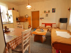V objektu v přízemí: chodba, společenská místnost (TV, WIFI, kachlová kamna, sedací souprava – 2x lůžko, jídelní stůl, židle, rádio, DVD přehrávač, 1x přistýlka), kuchyně (elektrický vařič, 2x lednice, mrazák, horkovzdušná trouba, varná konvice, toustovač, pračka), 1/2+1 ložnice (dvoulůžko + přistýlka).