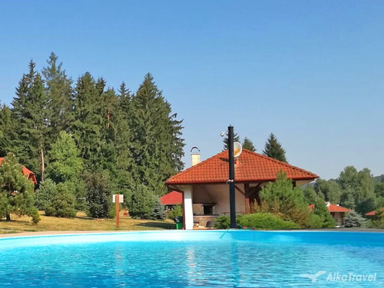 Dále je hostům k dispozici: jídelna s možností stravy, víceúčelové hřiště, centrální bazén, ohniště, stolní tenis, okrasné jezírko, altán s občerstvením, parkoviště.