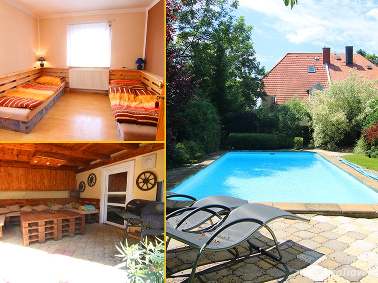 U objektu: oplocená zahrada, zastřešená terasa s posezením a grilem, zapuštěný bazén 10 x 4 x 1,6 m na pozemku u objektu (k bazénu se prochází skrz branku), lehátka, zahradní houpačka, pískoviště, parkování (max. 3 auta).