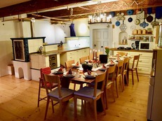 V objektu v přízemí: společenská místnost (kachlová kamna s možností spaní, stůl a židle pro 14 lidí) s kuchyňským koutem (sporák, lednice + mrazák, varná konvice, mikrovlnná trouba, myčka), 1/3 ložnice (dvoulůžko, samostatné lůžko, kamna), koupelna (vana, umyvadlo, WC), schody do patra.