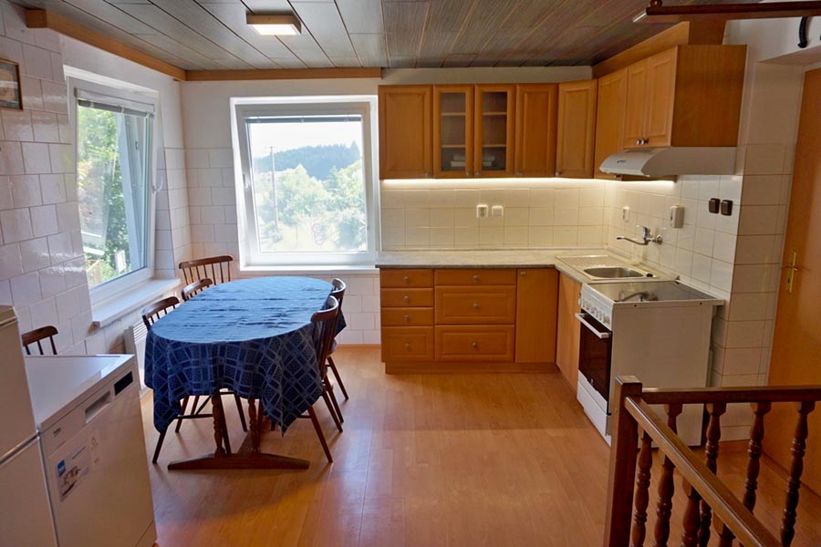 V objektu v přízemí: vstupní chodba (věšák, chodba), samostatné WC, schody do patra. V objektu v patře: kuchyň (varná deska, trouba, lednice+ mrazák, mikrovlnná trouba, varná konvice, kávovar, myčka nádobí, pračka, stůl, židle), společenská místnost (TV, 2x pohovka, konferenční stolek), 1/2 ložnice (dvoulůžko), 1/3 ložnice (3x samostatné lůžko), koupelna (sprchový kout, umyvadlo), samostatné WC.