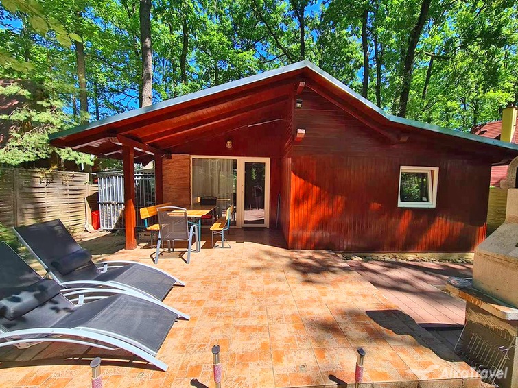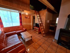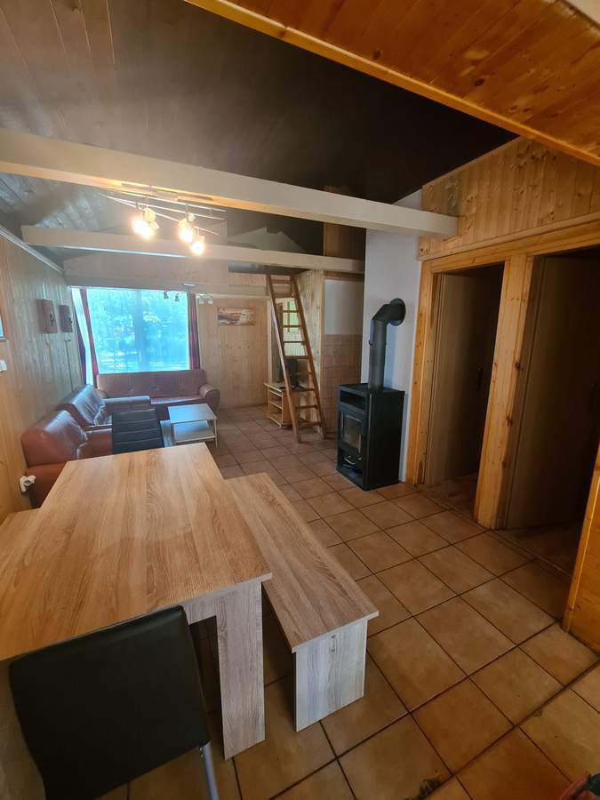 V chatě: zastřešená terasa (zahradní posezení), obývací místnost (rohová sedací souprava, konferenční stolek, TV, stůl, lavice, židle, krbová kamna, šatní skříň), kuchyně (dřez, rychlovarná konvice, lednice, mikrovlnná trouba, sporák, trouba), sociální zařízení (WC, umyvadlo, sprchový kout), v mezipatře (po schodech) pokoj ve 2 lůžky, 1x čtyřlůžková a 1x třílůžková ložnice. Topení: tuhá paliva, elektrické. Nekuřácký objekt.