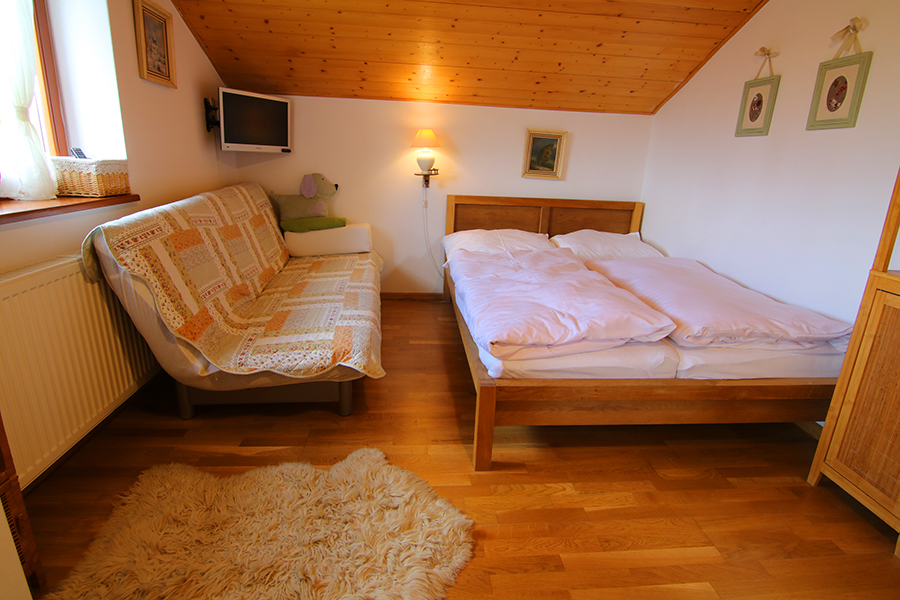 Druhý apartmán v patře 3 os.: obytná místnost s kuchyňkou (LCD TV, WIFI, keramická varná deska s 4 plotýnkami, lednice, varná konvice, myčka, stůl, židle, dvoulůžko, rozkládací pohovka - 1x přistýlka), koupelna (sprchový kout, umyvadlo, WC).