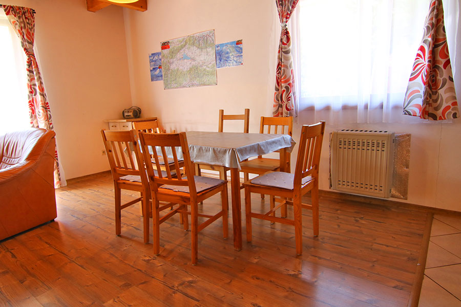 V objektu v přízemí: vstupní chodba, obývací místnost (LCD TV, WIFI, elektrický krb, pohovka – 2x přistýlka, menší pohovka, křeslo, CD přehrávač, výstup na terasu) s kuchyňským koutem (el. sporák – dvouplotýnka, lednice+ mrazák, kávovar, rychlovarná konvice, kontaktní gril, mikrovlnná trouba), koupelna (sprchový kout, umyvadlo, WC), schody do patra.