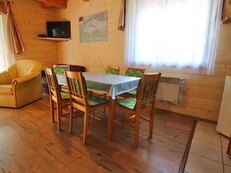 V objektu v přízemí: vstupní chodba, obývací místnost (LCD TV, WIFI, elektrický krb, pohovka – 2x přistýlka, menší pohovka, křeslo, CD přehrávač, výstup na terasu) s kuchyňským koutem (el. sporák – dvouplotýnka, lednice+ mrazák, kávovar, rychlovarná konvice, kontaktní gril, mikrovlnná trouba), koupelna (sprchový kout, umyvadlo, WC), schody do patra.