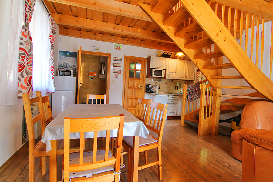 V objektu v přízemí: vstupní chodba, obývací místnost (LCD TV, WIFI, elektrický krb, pohovka – 2x přistýlka, menší pohovka, křeslo, CD přehrávač, výstup na terasu) s kuchyňským koutem (el. sporák – dvouplotýnka, lednice+ mrazák, kávovar, rychlovarná konvice, kontaktní gril, mikrovlnná trouba), koupelna (sprchový kout, umyvadlo, WC), schody do patra.