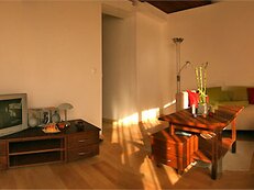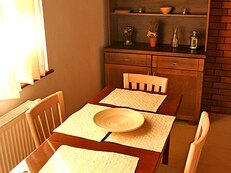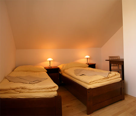 Ubytování (v každé chatě) v přízemí 1/2 ložnice (manželská postel), koupelna, WC, kuchyně (lednice, mikrovlnná trouba, sporák, varná konvice), obývací místnost s 2 lůžky, BVTV + SAT, HiFi, krb (vstup na terasu), v poschodí 1/4 lůžková ložnice (1x manželská a 2x samostatná postel) s balkónem, 1/2 ložnice (1x manželská postel), koupelna, WC.
