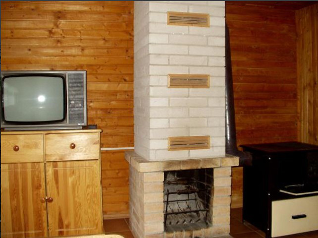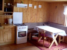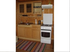 V chatě: terasa, chodba, společenská místnost (rohová sedačka, stůl, 2x židlička, kombinovaná skříň, TV, krb, přehrávač), kuchyňský kout (plynový sporák s el. troubou, lednice, rychlovarná konvice), koupelna (WC, sprchový kout, umyvadlo).