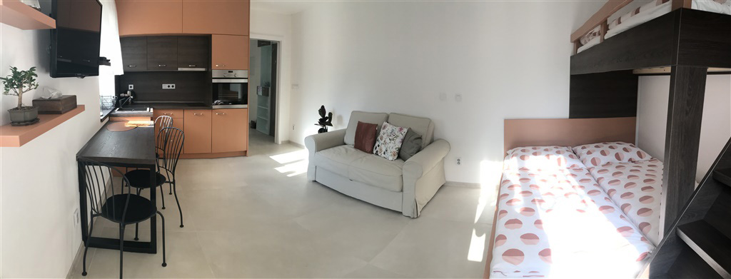V objektu: obývací pokoj - kuchyňský kout (posezení, TV, trouba, sporák, rychlovarná konvice, pračka, lednice s mrazákem, myčka), 1 x 1lůžková přistýlka - vysouvací lůžko u palandy, 1 x 1.5 lůžko přistýlka - rozkládací gauč, 1 x 3 lůžka palanda - dvoulůžko dole, nahoře 1 lůžko, koupelna (sprchový kout, umyvadlo, WC).