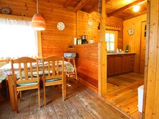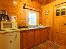 V přízemí objektu: předsíň, koupelna - sprchový kout, umyvadlo a WC, společenská místnost (rádio, krb, pohovka) s kuchyňským koutem (el. vařič - dvouplotýnka, lednička s mrazákem, rychlovarná konvice, kávovar, mikrovlnná trouba), společenská místnost s posezením, 1/4 ložnice (2x samostatné lůžko, 1x patrová postel).