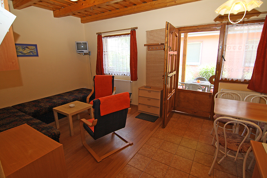 V objektu: 1/2 ložnice (dvoulůžko), kuchyňský kout a obývací místnost (BVTV, plynový sporák, lednice, mrazák, mikrovlnná trouba, varná konvice, 2x samostatná postel, stůl, židle, rádio), koupelna (sprcha, umyvadlo, fén, WC). Topení: ústřední.