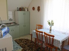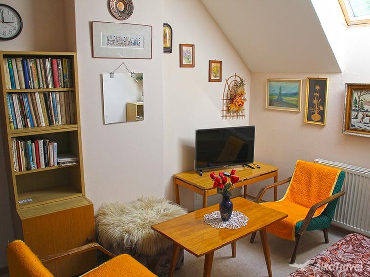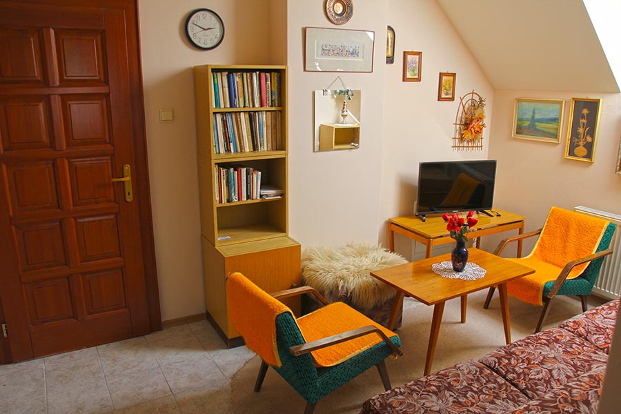 V apartmánu: samostatný vchod, vstupní chodba, obývací místnost (TV, pohovka, konferenční stolek, křesla), kuchyň (plynový sporák, trouba, lednice + mrazák, varná konvice, mikrovlnná trouba), 2x 1/3 ložnice (vždy dvoulůžko a samostatné lůžko), koupelna (sprchový kout, umyvadlo, WC).