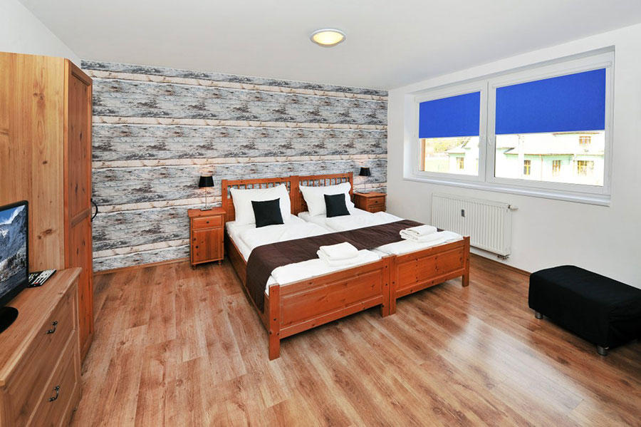 Apartmán "B" pro 8 osob /80 m2/: obývací místnost (TV + SAT, WIFI, rozkládací pohovka - 2x přistýlka), 2/3 ložnice (vždy dvoulůžko a samostatné lůžko), kuchyně (el. dvojplotýnka, lednice, mikrovlnná trouba, varná konvice) s jídelním koutem (stůl + židle), koupelna (sprchový kout, umyvadlo, WC). Apartmán může být s balkónem i bez balkonu.