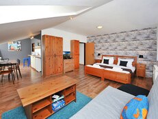 Studio "C" pro 4 osoby /48 m2/: obývací místnost (TV + SAT, WIFI, dvoulůžko či 2x oddělené lůžko, rozkládací postel - 2x přistýlka), 1/2 ložnice (dvoulůžko), kuchyně (el. dvojplotýnka, lednice, mikrovlnná trouba, varná konvice) s jídelním koutem (stůl + židle), koupelna (sprchový kout, umyvadlo, WC). Apartmán může být s balkónem i bez balkonu. Topení: plynové.