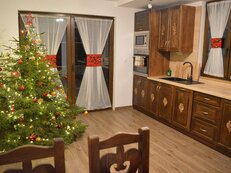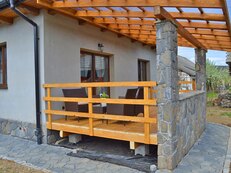 V objektu v přízemí: vstup přes verandu (zahradní posezení), obývací místnost (TV + SAT, krb, stolek, křesla, rozkládací pohovka - 2x přistýlka), kuchyně (varná deska, trouba, lednice, mikrovlnná trouba, rychlovarná konvice, myčka nádobí) s kuchyňským koutem (stůl, židle), 2x 1/3 ložnice (vždy samostatná postel a postel, které se dá rozložit na dvoulůžko), koupelna (sprchový kout, umyvadlo, WC). Topení: v suterénu kotelna provozovaná majitelem, tuhá paliva - krb. Domácí zvíře: ano, pouze malá rasa.