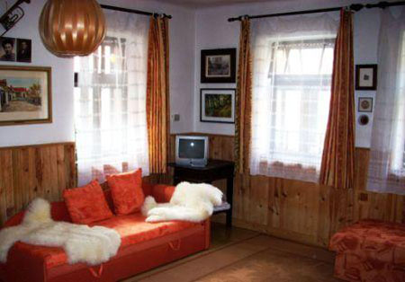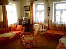 Zadní část chalupy je spojená s přední částí krytou verandou a má samostatný vstup do další obývací místnosti - rozkládací gauč, komodou a vstup dřevěným schodištěm do 1/2 podkrovní ložnice. Možnost obsazení jen přední části chalupy - max. 7 osob. Topení: krbová kamna + elektrické.