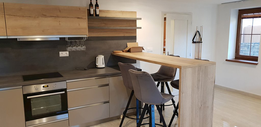 V patře: společenská místnost (TV, posezení, gauč s možností 2 přistýlek), kuchyň (jídelní stůl s posezením, myčka nádobí, rychlovarná konvice, mikrovlnná trouba, sporák, trouba, lednice s mrazákem, toustovač), 1/4 ložnice (dvoulůžko a 2x přistýlka, TV), koupelna (sprchový kout, umyvadlo, samostatný WC a pračka).